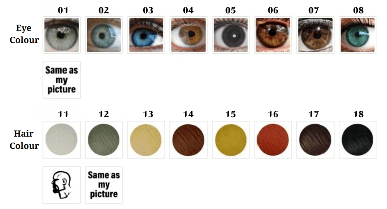 Choose your preferred eye and hair colors from the chart below, or we’ll use the colors from the image you sent.